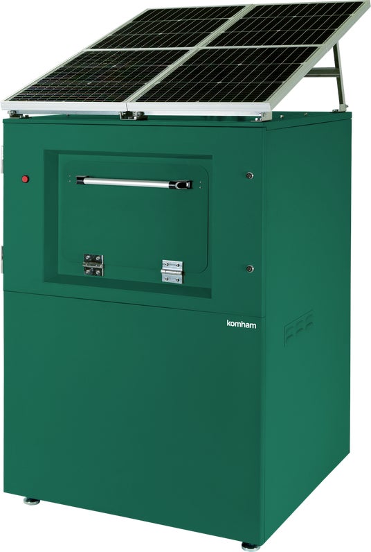特徴:AC電源や排水処理を必要としないソーラー発電で自動駆動する独立型の生ごみ処理機です。生ごみの高速処理が得意な微生物群「コムハム」がより安定して生ごみを分解できる環境をスマートコンポスト内に整えています(※1特許取得済)。また、管理者は、クラウドにアップロードされたデータから、投入生ごみ量、生ごみ分解量/分解率、温室効果ガス排出削減量、バッテリー残量を取得することができ、エラー発生時はアラートがあがるため、最低限のメンテナンスで運用ができます。