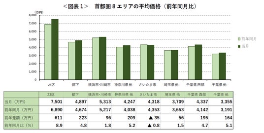 首都圏全体の平均価格は前月比、前年同月比ともに上昇した。