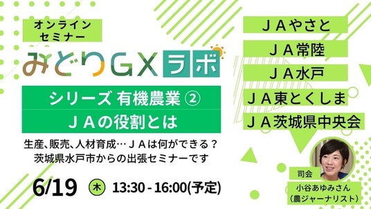 6月19日(木)には、「シリーズ有機農業」の第2弾として、「JAの役割とは」をテーマとしたセミナーを開きます。有機農業を巡っては、地元自治体との連携や販路の確保、生産者の育成・指導など、JAが果たす役割が注目されています。本セミナーは、JAグループが率先して有機農業に取り組む茨城県から、みどりGXラボ初の出張セミナーとして配信。茨城県内の3JA(やさと、常陸、水戸)と、徳島県のJA東とくしまを迎え、JAが有機農業に関わる意義や、具体的な取り組み方を聞きます。