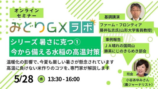 みどりGXラボは、活動2年目となる2025年度、会員の関心の高い「有機農業」と「温暖化(高温)対策」をオンラインセミナーで重点的に取り上げ、深掘りしていきます。温暖化対策では、第1弾として「シリーズ暑さに克つ1.今から備える水稲の高温対策」を5月28日(水)に開きます。夏場の高温が常態化し、米の品質などに深刻な影響を及ぼしている中、高温に負けない米づくりのコツを専門家に聞きます。講師は、水稲の栽培技術に詳しく、各地で高温対策の講演を行うファーム・フロンティアの藤井弘志さん(山形大学農学部客員教授)。高温耐性品種「にじのきらめき」の生産部会を立ち上げたJA晴れの国岡山の事例報告も行います。稲作農家必見のセミナーです。