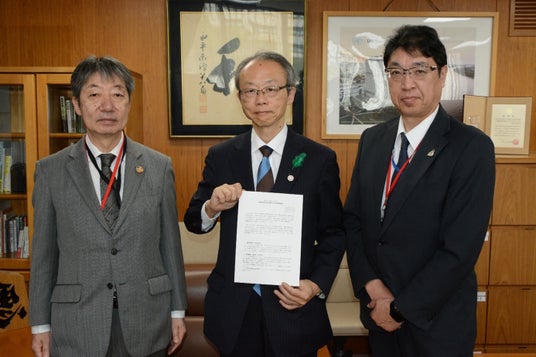 写真=渡邊農水次官(中)に提言を渡すみどりGXラボの枝元代表(左)と日本農業新聞の田宮社長(2025年4月21日、東京・霞が関の農水省で)