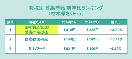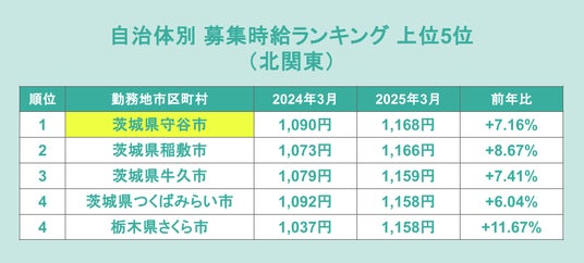 さらに、2025年3月時点の募集時給を前年比のランキングで分析し、時給上昇率に勢いのある北関東エリアの自治体を調査しました。