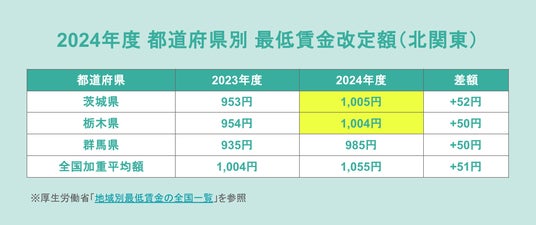 北関東エリアでの最低賃金引き上げ額を都道府県別に見てみると、それぞれ50~52円の引き上げ幅となっています。茨城県と栃木県の2県では、2024年度の最低賃金改定により、最低賃金が1,000円を超えました。