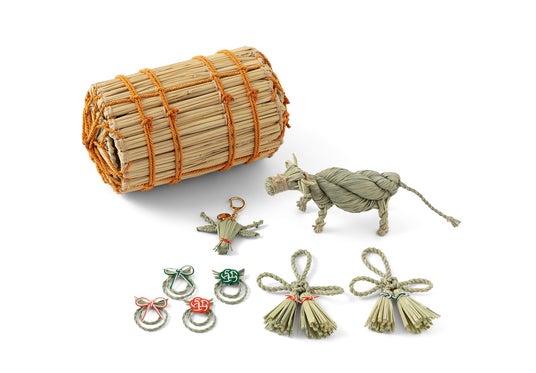 日本相撲協会の土俵づくりも請け負う株式会社わらむによる俵貯金箱、牛の置物、わら飾り、キーホルダー