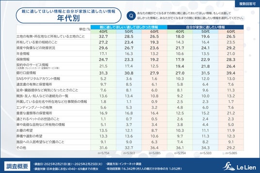 「親が亡くなるまでに遺しておいてほしい情報/遺してほしかった情報」と「回答者自身が亡くなるまでに家族に遺したい情報」に関して調査しました。