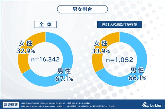 相続・終活に関するプラットフォーム事業を展開する株式会社ルリアン(本社:京都府京都市、代表取締役会長兼 CEO・藤巻 米隆)は、相続・終活に関する全国調査2025を実施し、16,342人(一人の親だけが存命の方1,052人を含む)から回答を得ました。結果報告は今後4回にわたり公開する予定です。今回は結果報告の第1弾として、相続・終活に関するデータを報告します。次回は、相続土地国庫帰属制度の最新利用状況を交えた「空き家・不動産に関するデータ」を5月下旬に公開する予定です。