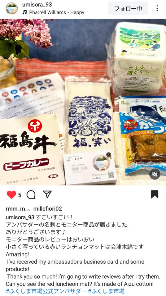 ■福島県産品や観光地・イベント情報のSNS発信アンバサダーには、ふくしま市場で取り扱う県産品をはじめ、福島県内の観光地や地域イベントの魅力を、写真や動画とともにSNSで発信していただきました。投稿には「行ってみたい」「美味しそう」「知らなかった!」といったコメントが寄せられるなど、多くの方に福島の魅力が届いています。