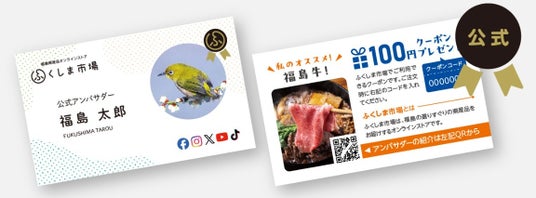 特典として、ふくしま市場公式アンバサダー専用の名刺を制作・配布いたしました。名刺裏面のクーポンコードは、ふくしま市場でご利用いただけるのでご家族やお友だちなどへの紹介にも活用いただいています。