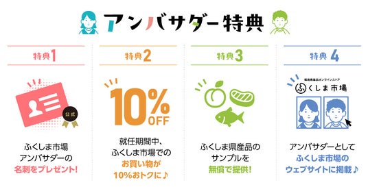 ふくしま市場公式アンバサダーには、ふくしま市場の販売商品をはじめ、福島県の農産物・特産品、県内各地の観光スポットなどを紹介いただき、SNSを中心としたさまざまなメディアでその魅力を発信していただきます。活動には「#ふくしま市場公式アンバサダー」のハッシュタグを活用し、全国の皆様へ福島の「おいしい」や「すばらしい」を届けてまいります。