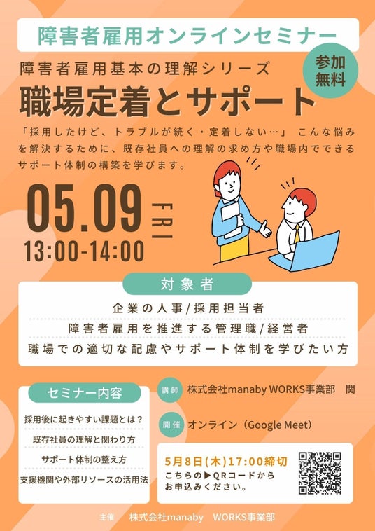 就労支援事業を行う株式会社manaby(本社:宮城県仙台市、代表取締役社長:岡崎 衛)は、企業向けオンラインセミナー「障害者雇用 基本の理解シリーズ 職場定着とサポート」を開催します。