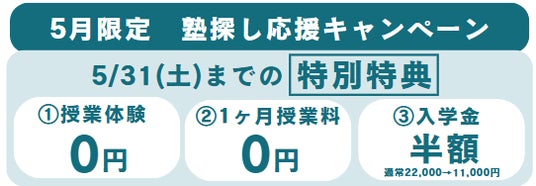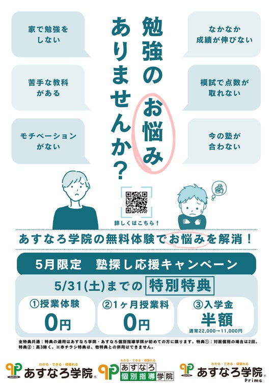 あすなろ学院では、さまざまなお悩みの声を受け、5月限定の塾探し応援キャンペーンを開催します。