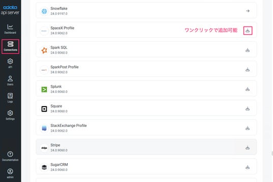 ・400以上のCData コネクタに標準対応:従来のバージョンで必要だったデータソース拡張用のCData コネクタを個別にインストールする必要がなくなり、Connections(接続管理)画面でSnowflake やCSV、Google Sheets をはじめとするコネクタを画面上からワンクリックで追加して接続の作成が可能になりました。