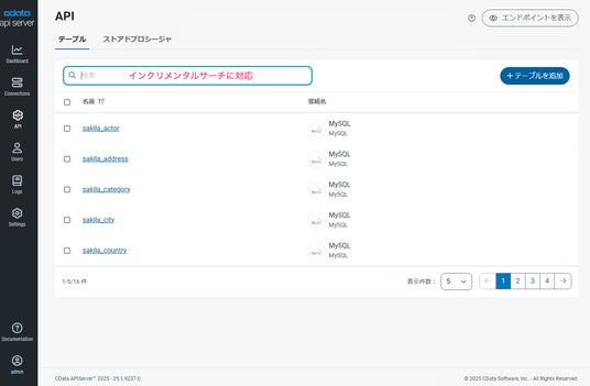 ・API の一覧画面を刷新し、大規模ユーザーの利便性を向上:文字を入力するだけで検索を実行するインクリメンタルサーチに対応した検索機能を追加し、膨大な数のAPI を使用する大規模なユースケースでも目的のAPI にすぐにアクセス可能になり、管理者の負担を軽減します。