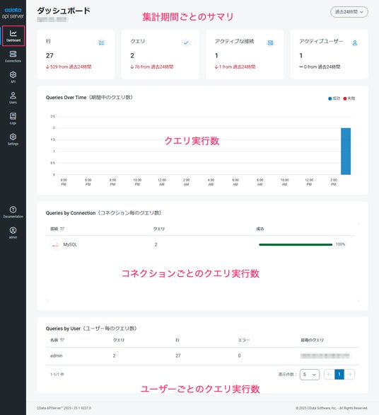 ・ダッシュボード画面のリニューアル:コネクションごとのクエリ数、実行エラーなどの状況、API 経由で取得したレコード数やクエリの実行数、アクティブな接続とユーザー数などCData API Server 全体の利用状況のサマリが一目で確認可能になりました。