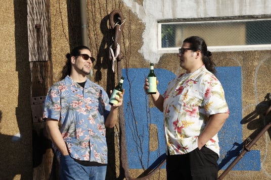 夏の定番アロハシャツを着こなす斉藤ジュン(左)と斉藤レイ(右)