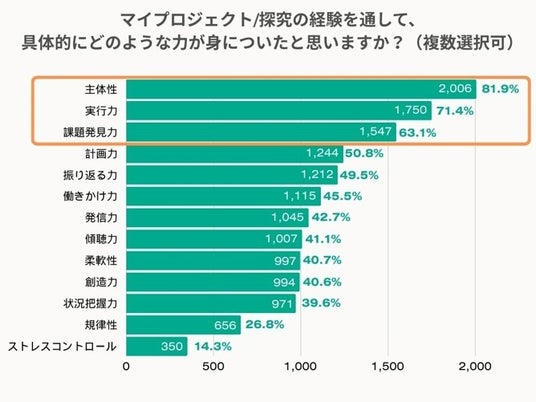 探究学習で身についたと思う力TOP3は「主体性」「実行力」「課題発見能力」