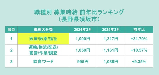 最後に須坂市の2024年3月から2025年3月にかけた募集時給上昇率を、10件以上出稿のある職種別に見てみると、「医療/医薬/福祉」が+31.70%で1位となりました。続いて「運輸/物流/配送/警備/作業/調査」が+10.57%、「飲食/フード」が+9.35%となっています。