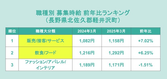 販売系職種の求人では、「Reebok 軽井沢ショッピングプラザ店」が2025年4月のオープンに向けて時給1,500円の求人を出稿しています。また飲食系の求人では、「軽井沢 うなぎ四代目菊川」における時給1,800円の募集が最高額となっています。軽井沢町は有数の観光地でもあり、時給水準が高くなっている様子がうかがえました。