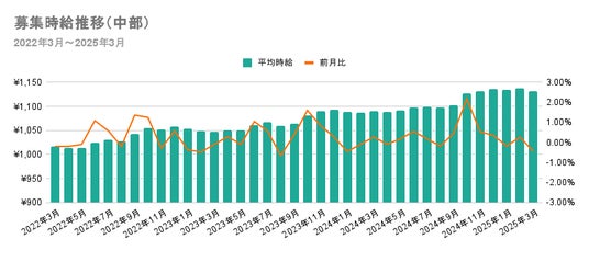 中部エリアにおける、2022年3月から2025年3月まで3年間の募集時給を分析します。