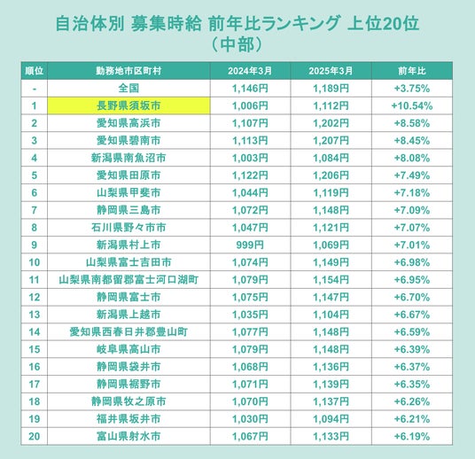 さらに、2025年3月時点の募集時給を前年比のランキングで分析し、時給上昇率に勢いのある中部エリアの自治体を調査しました。