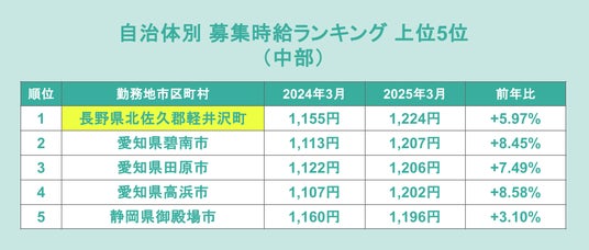 まずは、2025年3月の募集時給額をランキングで見てみると、長野県北佐久郡軽井沢町が1,224円で1位となりました。次いで愛知県碧南市が1,207円、愛知県田原市が1,206円、愛知県高浜市が1,202円、静岡県御殿場市が1,196円と続いています。上位5位中3つの自治体が、愛知県からのランクインとなりました。