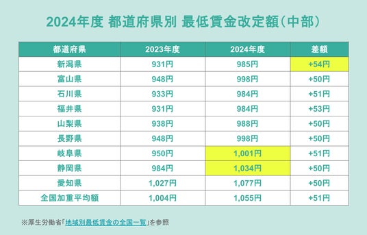 中部エリアでの最低賃金引き上げ額を見てみると、それぞれ50~54円の引き上げ幅となっています。岐阜県と静岡県の2県では、2024年度の最低賃金改定により、最低賃金が1,000円を超えました。