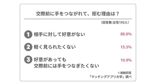 ここまででの調査結果では、付き合う前に手をつながれるのがOKかNGか、女性によって意見が分かれてしまいハッキリと見極めるのは難しそうでした。それでは、交際前に手をつないで拒まれない場合は、交際OKの合図と思っていいのでしょうか。交際前に手をつながれて拒まない場合の理由を聞いてみました。