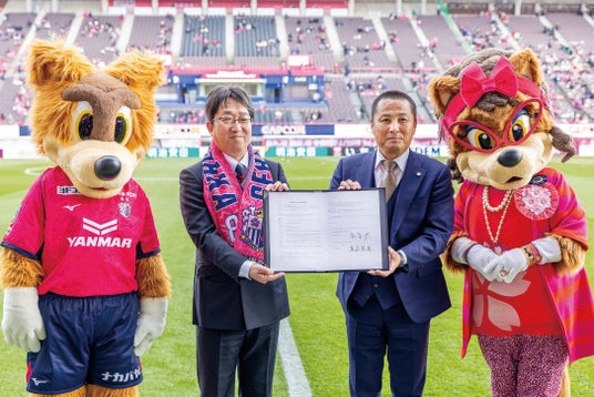 「ヨドコウ桜スタジアム」での協定締結式後の記念撮影。右がセレッソ大阪の森島寛晃社長(現会長)、左がUR西日本支社長の高原 功。セレッソ大阪のチームキャラクターであるロビーとマダム・ロビーナと一緒に。