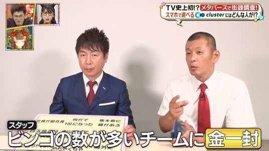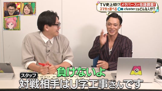 今回は、累計3500万人を超える日本発のメタバースプラットフォーム「cluster」を、U字工事・東京ホテイソンに調査していただきつつ、お題に当てはまる人を探すビンゴ形式で対決していただきました。