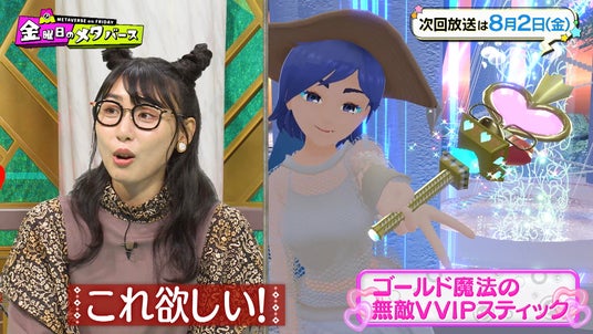 メタバースアイテムクリエイターの「かわしぃ」にアンジェリカが話を聞くと「メタバースを歩く人たちは写真を撮るので、映えるモノがいい!」とアドバイスをもらいます。すると、「メタバースの住民はギャルってことか」と試行錯誤しながらアンジェリカがデザイン。最終的に、「ゴールド魔法の無敵VVIPスティック」が完成しました。このアイテムは7月26日から販売開始します。