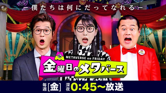 テレビ朝日が毎週金曜日深夜0時45分から放送する「金曜日のメタバース」は、MCのモグライダー・ハシヤスメ・アツコ、国内最大級のVTuber事務所「にじさんじ」に所属し登録者40万人超えのVTuberレオス・ヴィンセントと、毎回避けては通れないバーチャルな話題や最新トレンドなどをVTuber・メタバース民・ヒトが集うカオスなスタジオからお届けしています。