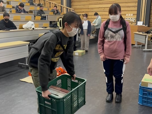 「最初は装着に戸惑ったが、慣れると動きやすかった。もっと軽い素材になれば、さらに使いやすくなると思う」(花き経営学科)