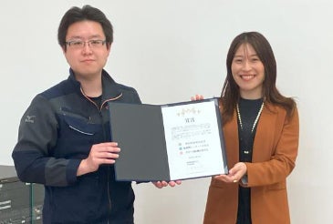 ▲置賜建設株式会社代表取締役・川野 敬太郎氏と当社取締役コンサルタント・浜田紗織(2025年4月25日の署名式での様子)