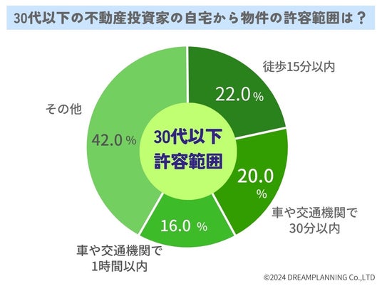 自宅から不動産投資物件の許容距離について年代別に分けてみました。30代以下は歩くなら15分以内、それ以上は車や交通機関で1時間程度がおおむね許容範囲となっています。