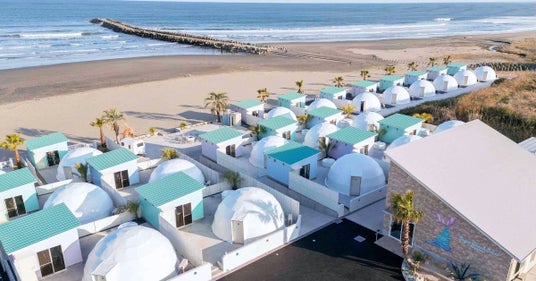 茨城県大洗町の海岸沿いに位置する、グランピングリゾートです。全室オーシャンビューの開放的なロケーションが魅力で、目の前に広がる大洗の海を眺めながら、非日常のリゾート時間をお楽しみいただけます。