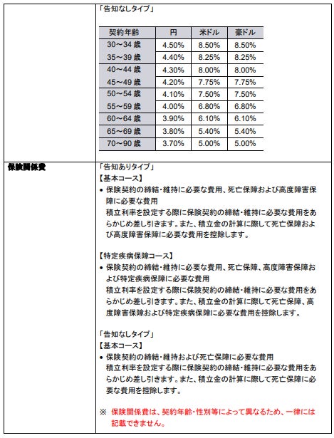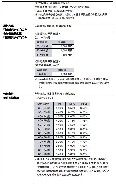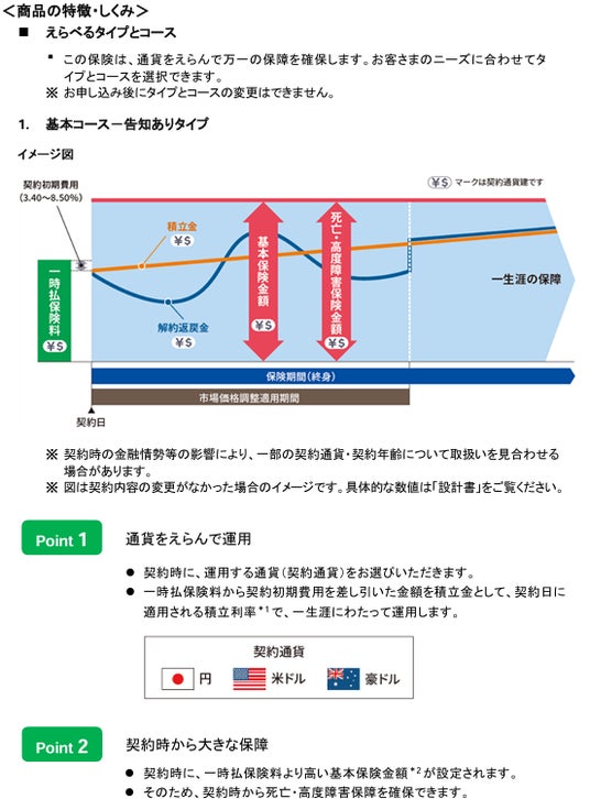 『未来につなげる終身保険v2』は、一生涯にわたって万一の保障を確保し、少しでも多くの資産を安心してご家族にのこしたいというお客さまのニーズにお応えする資産形成機能も備えた一時払終身保険です。円・米ドル・豪ドルから契約通貨をお選びいただき、お客さまのニーズにあわせて、死亡保障・高度障害保障*1のみの基本コースと、さらにガン等の病気に備えられる特定疾病保障コース*2のいずれかをご選択*3いただけます。また、基本コースでは、契約後すぐに一時払保険料より大きな保障が確保できる「告知ありタイプ」と、契約初期の一定期間の保障を抑制し、その後の保障額を大きくすることで将来の手厚い死亡保障を確保できる「告知なしタイプ」をご用意しています。