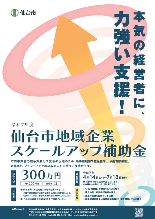 仙台市地域企業スケールアップ補助金事務局(電話)022-214-7338(平日9時~17時)