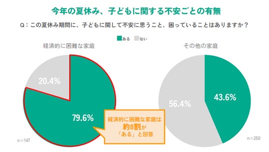 夏休みの子どもに関する不安ごとについて聞いた設問では、経済的に困難な家庭では8割が「ある」と回答。その他の家庭で「ある」と回答したのは43.6%で、割合に大きく差がありました。