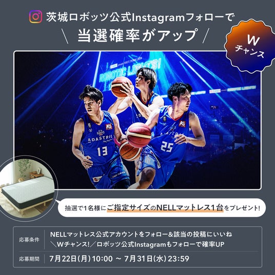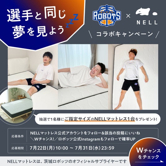 これを記念し、2024年7月22日~7月31日の期間、茨城ロボッツの選手たちにご愛用いただいている「NELLマットレス」シリーズのお好きなサイズが当たる「選手と同じ夢を見よう」キャンペーンを実施します。