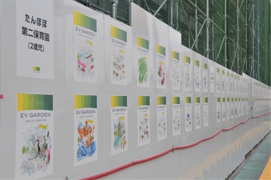 株式会社EV GARDENは、福島日産のグループ会社です。現在、2025年秋のオープンを目指し福島市北町に建設中の、地域に新しいくつろぎとにぎわいを創出する施設「EV GARDEN」。その工事現場の仮囲いに、同市の保育園に通う子どもたちが思い思いに色を散りばめた塗り絵を掲出しています。