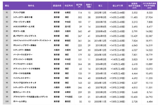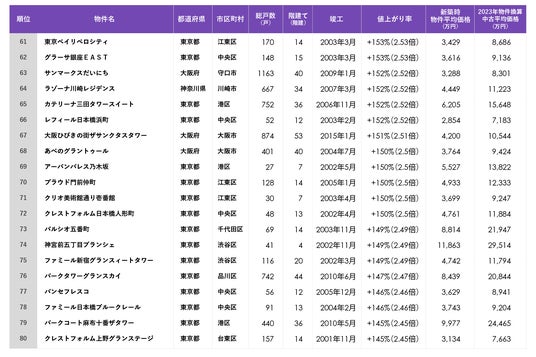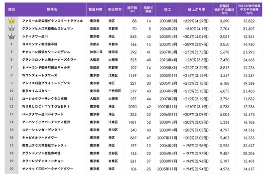 今回は、首都圏、関西、東海エリアで2023年(~12月末時点)に中古流通した住戸の中で各物件最も値上がりした住戸を元に中古マンションの値上がりランキングを作成しました。