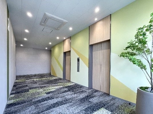 内装は、四季をコンセプトに、各階で異なるテーマカラーを設け、共用廊下・EVホール等をデザイン。5階最上階は「スカイラウンジ」として、ハイサッシから筑波山を臨むことのできる、天高約4.5mの開放感ある空間とし、入居企業の従業員が心地よく休憩可能なスペースに仕上げています。また、エントランスには折上げ天井と壁面の一部に、つくばみらい市の木である桜と、市の花である菜の花をイメージしたグラデーションのある左官を施し、落ち着いた風合いで従業員を出迎えます。