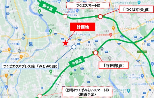 「MFLPつくばみらい」は、常磐自動車「谷田部」ICから約4.0km、圏央道「つくば西」SICから約3.6kmに位置し、国道354号線へのアクセスも可能です。常磐道を利用し東京都心まで約1時間30分程度で配送が可能で、東北エリアへの配送も対応できます。圏央道を利用することで関東近郊へもアクセスが良く、広域配送にも適しています。また、つくばエクスプレス「みどりの」駅から徒歩15分と公共交通機関による通勤利便性も高く、入居企業の人材確保においても優位性のある立地です。