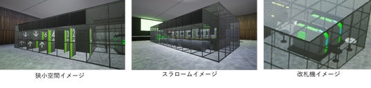 レースコースは、鉄道の駅をモチーフに設計します。ドローンが天井裏・床下空間をイメージした構造の中を巧みに飛行し、Suicaを実際の改札機にタッチしてゴールします。見慣れた駅の風景に、ドローンが飛び交う未来の都市像を重ねたコースです。