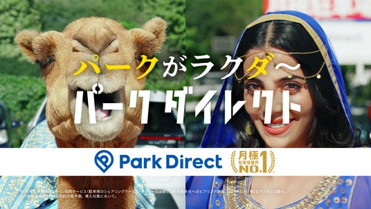 パークダイレクト のカラーである “青” を基調とした布を背中に掛け、砂漠の国から“車両”として来日したラクダが首から日本のナンバープレートを下げ、月極駐車場に座って「駐ラクダ」している強烈なインパクトのCMです。ラクダの持ち主である“女性(=ドライバー)”も登場し、スマホで月極駐車場が契約できて喜び踊っています。