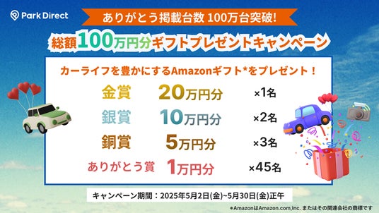 月極駐車場の掲載台数100万台突破を記念し、「掲載100万台突破!総額100万円分ギフトプレゼントXキャンペーン」が、2025年5月2日(金)~2025年5月30日(金)正午まで開催されます。スマホやPCでダイレクトに月極駐車場が探せて最短約5分で利用開始できるオンラインサービス「パークダイレクト」を提供する当社として、皆様のカーライフを豊かにするための総額100万円分のギフトをご用意いたしました。キャンペーン期間中に応募条件を満たした方の中から、最大20万円分のデジタルギフトが当たります。