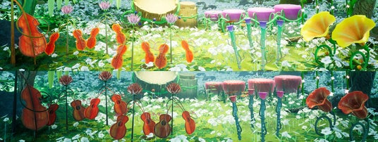 「音のなるふしぎな森」は、深い森の中に生息する、楽器をモチーフにした植物たちをタッチして、様々な音を奏でて遊ぶ体験型のデジタルコンテンツです。シカやウサギなどの動物たちがひっそりと暮らす自然豊かな森の中に、ピアノやドラム、バイオリン、ギターなどの楽器をモチーフにした草木や花が並び、それらをタッチすると楽器の音色を聴くことができます。
