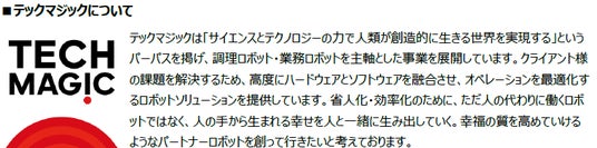 テックマジックは、2018年2月に設立。「サイエンスとテクノロジーの力で人類が創造的に生きる世界を実現する」をパーパスに掲げ、食を取り巻く多くの企業が直面する人手不足を解消し、人がより付加価値の高い業務に従事し、生産性の高い社会を実現するために、最新のAIやロボット技術を高度に融合した各種プロダクトの企画、設計、販売、保守を行っています。