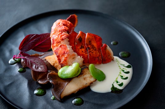 シェフが目の前からサーブする"オマール海老バターソテー 蚕豆とアワビ茸とエストラゴンオイルと共に"(1名につき一皿)