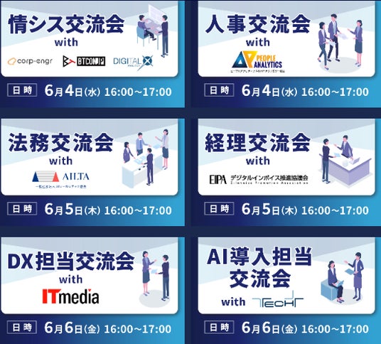 担当者同士の横のつながりを深め、DX推進に関する悩みや課題を共有する場として、新たに情シス、人事、法務、経理、DX担当者、AI導入担当者向けの交流会を初開催!日常業務の中で抱えるさまざまな問題について、他社・他自治体の経験や知見を交換し、新たな視点を得ることができる場です。部門別の交流会を毎日2つのテーマで開催!1日目:6月4日(水) 16:00~17:00